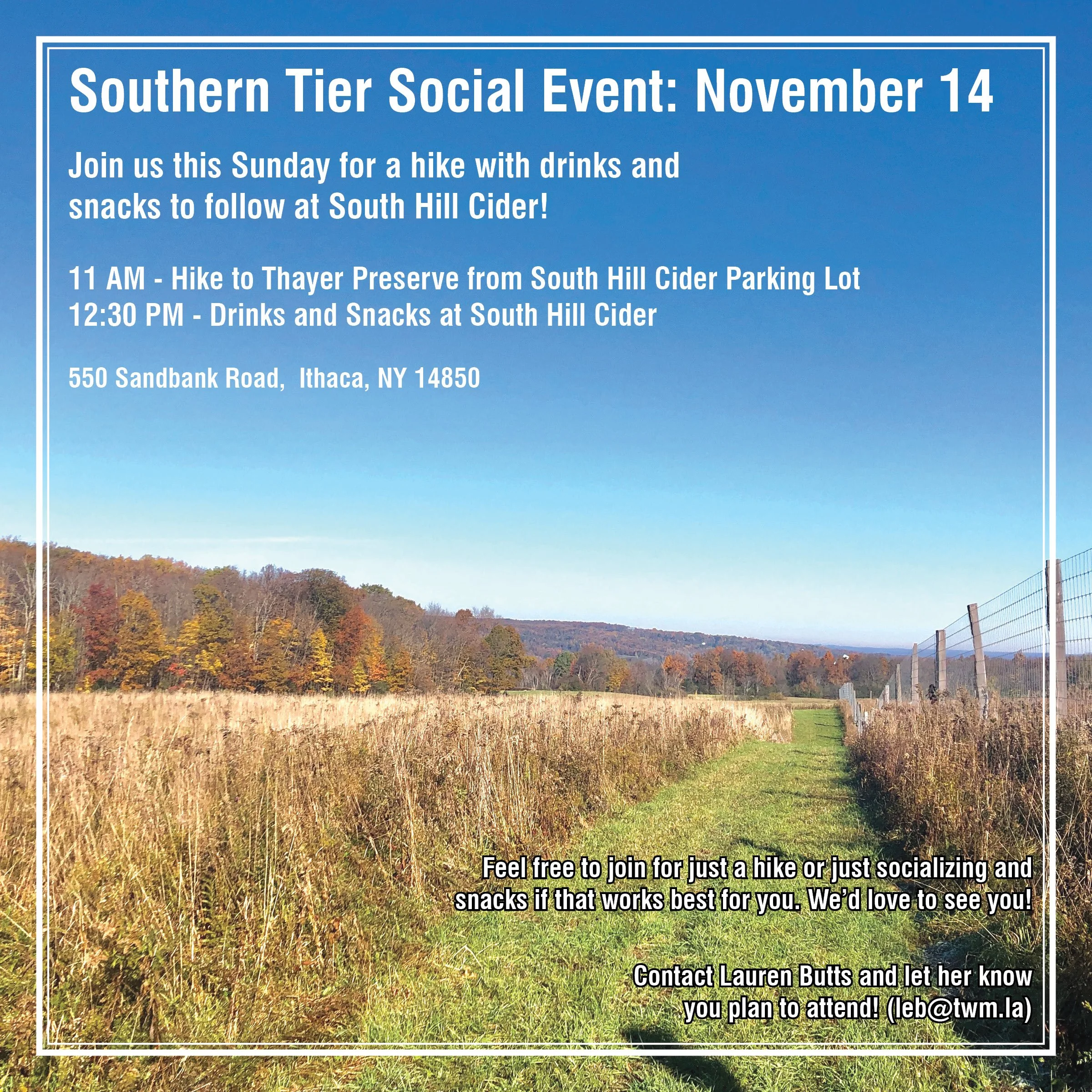 Join members of the Southern Tier Section this Sunday, November 14, for a social hike and drinks/snacks afterwards at South Hill Cider!