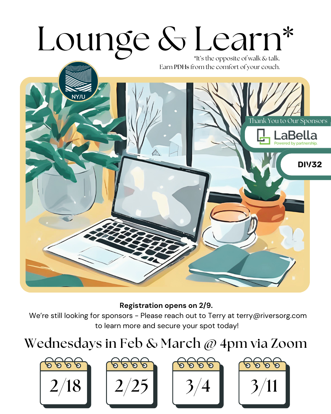 Earn CEUs from the comfort of your couch (or desk) and spend time virtually with your NYU ASLA friends. Presentations will be held on Wednesdays in February (2/18 & 2/25) and March (3/4 & 3/11) at 4 pm over Zoom. Additional information on topics and registration will be available soon.