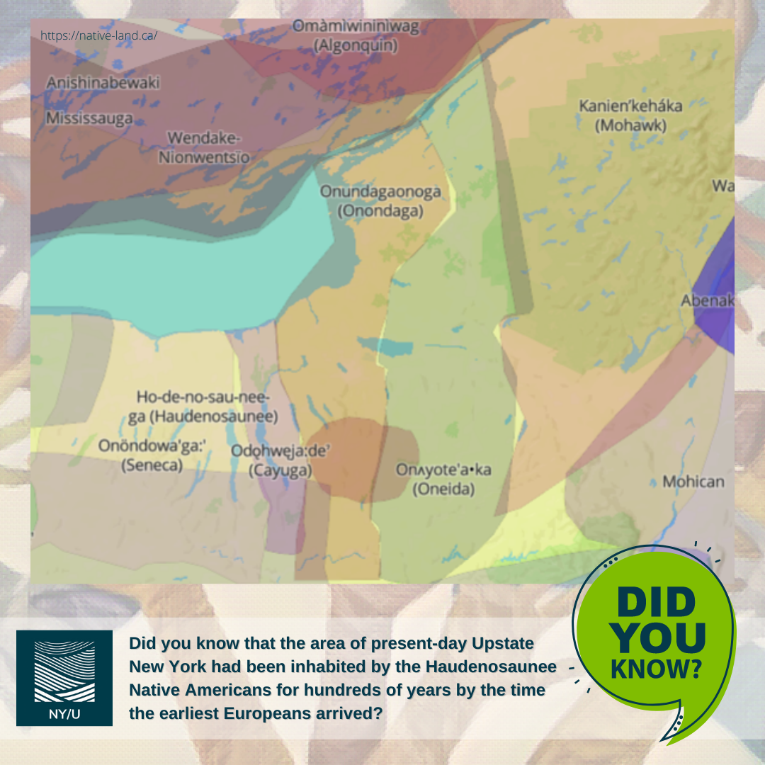 Did you know that the area of present-day Upstate New York had been inhabited by the Haudenosaunee Native Americans for hundreds of years by the time the earliest Europeans arrived? You can look up the indigenous territory you are living on using the Native Digital Land mapping tool.